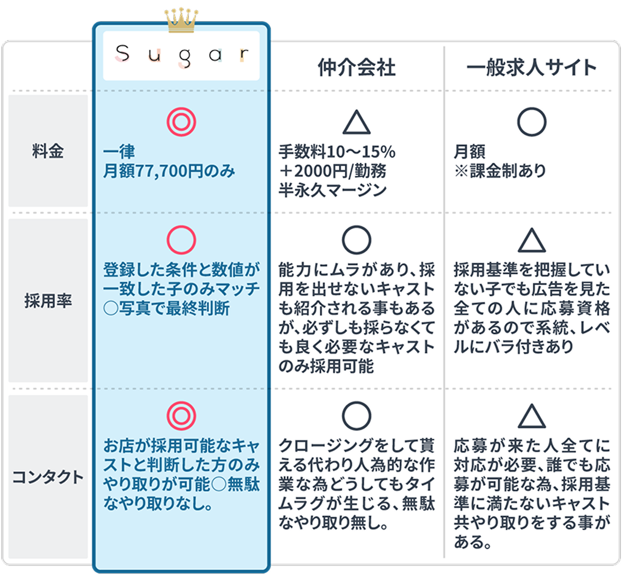 求人サイトの場合、女性が数ある店舗の中からお店を選ぶところからスタートしていたため、プラン勝負で採用費用を掛けられない店舗にはチャンスすらありませんでした。対してSUGARのマッチングシステムは数値によって店舗様と女の子を繋げる為、条件(数値)さえマッチングすれば女の子へ条件を送る事やメッセージを送るなどのアピールも可能です。