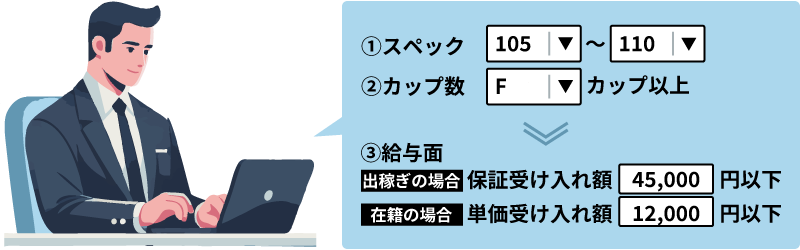 すべての条件(スペック値+カップ数+給与面)が一致した場合のみ、マッチングが成立します。