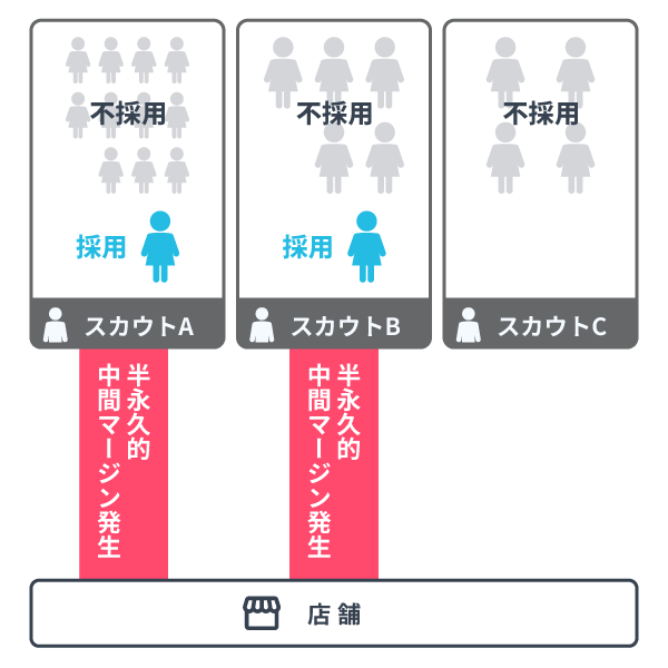人為的作業の為、伝達ミス(条件の相違)能力や抱えている女の子の数によってレスポンスの速さにムラが有り条件を最速で届けるのが難しい。ただし経験豊富で自店の求めるキャストを正確に紹介できる人もいるので採用までのスピードも速く、質の高いキャストを紹介してくれるケースもある。逆の場合1回で採用が決まらず…。また女の子一人当たりに中間マージンがかかってくる為利益率が乏しい。